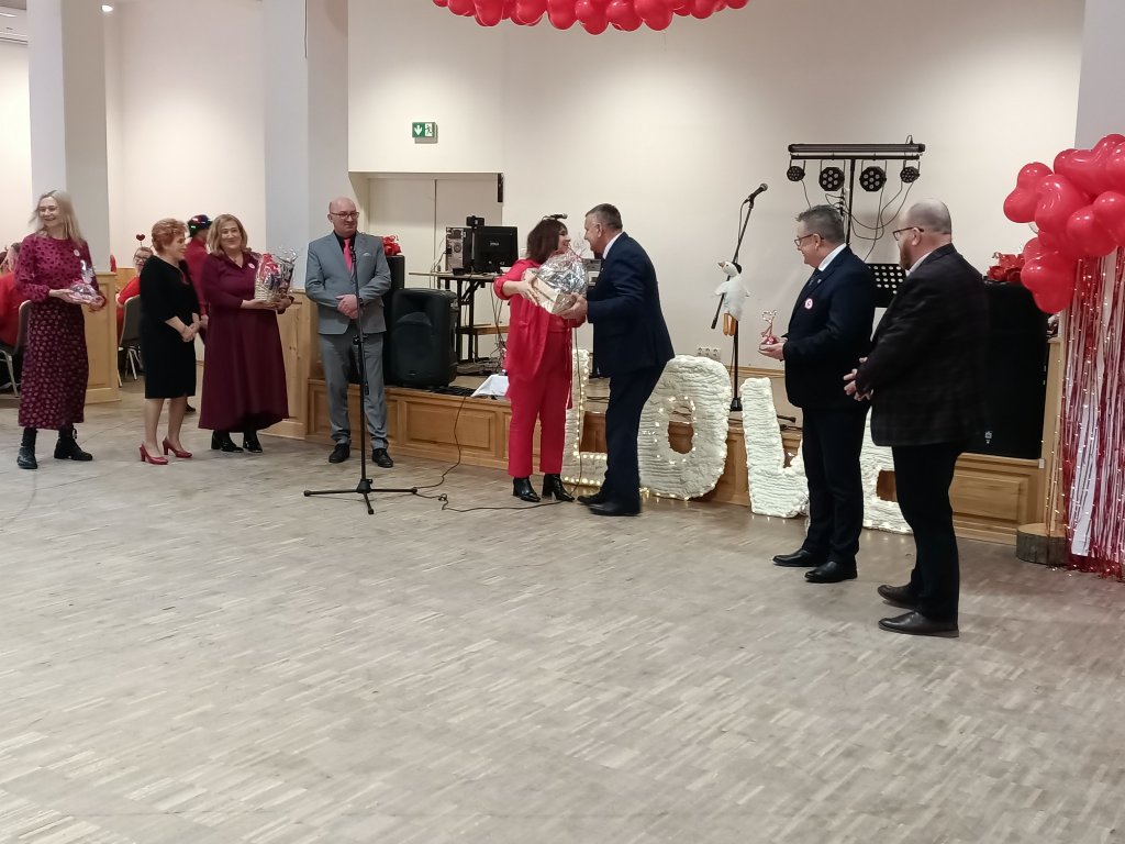 Spotkanie walentynkowe przebiegło pod znakiem ciekawych konkursów poprowadzonych przez instruktorów k-o Pana Tadeusza Kiejrys i Panią Paulinę Wołoch oraz tańca, gdzie mogliśmy się integrować. W jednej z tanecznych zabaw, wszystkich mieszkańców poprowadzili do poloneza Pani Dyrektor DPS w Podzamku Jolanta Leszko wraz z Panem Wójtem Gminy Kłodzko Zbigniewem Turem. Na zakończenie zabawy wybrano królową balu Patrycję z DPS w Bystrzycy Kłodzkiej i króla balu Janka z DPS w Podzamku.