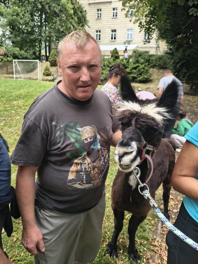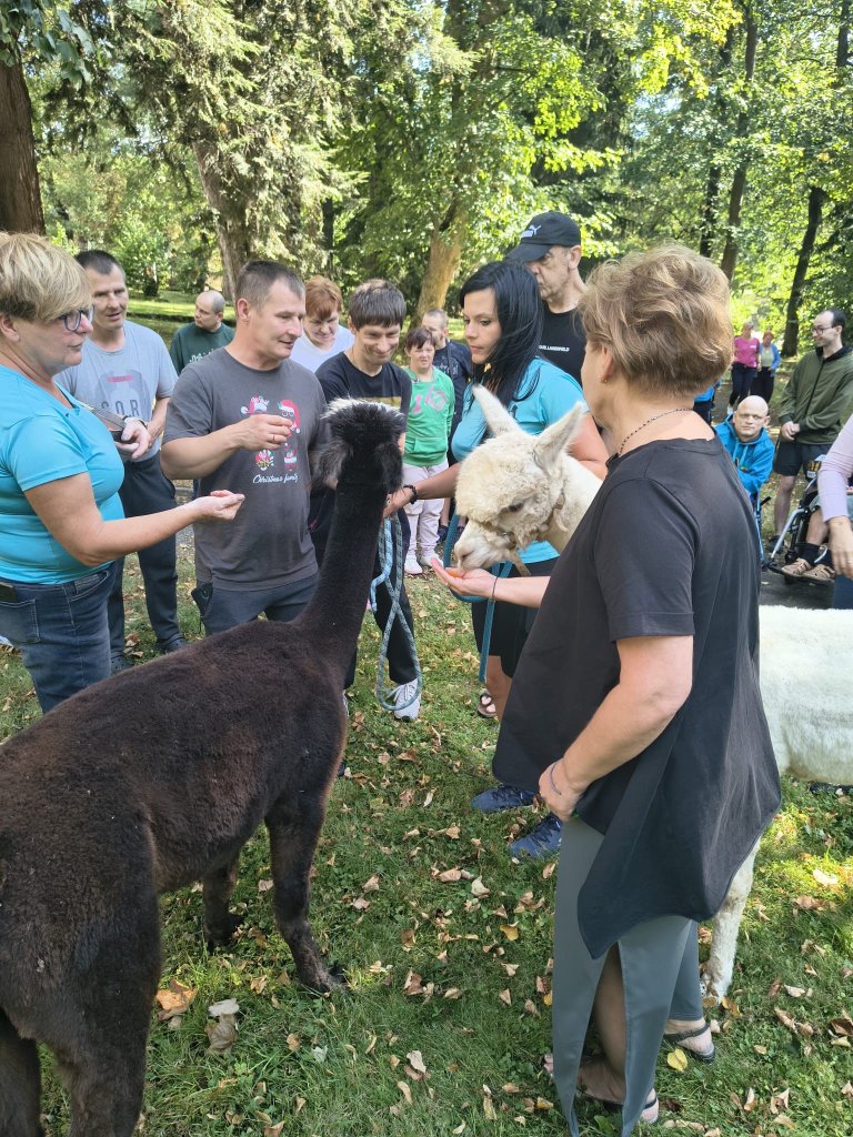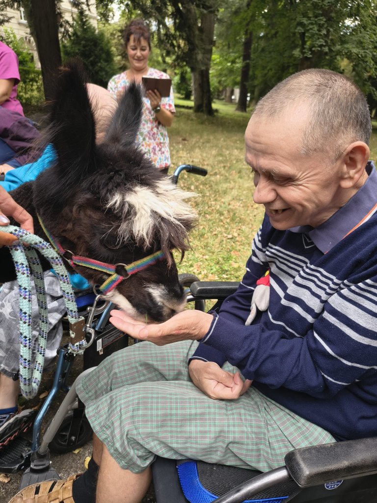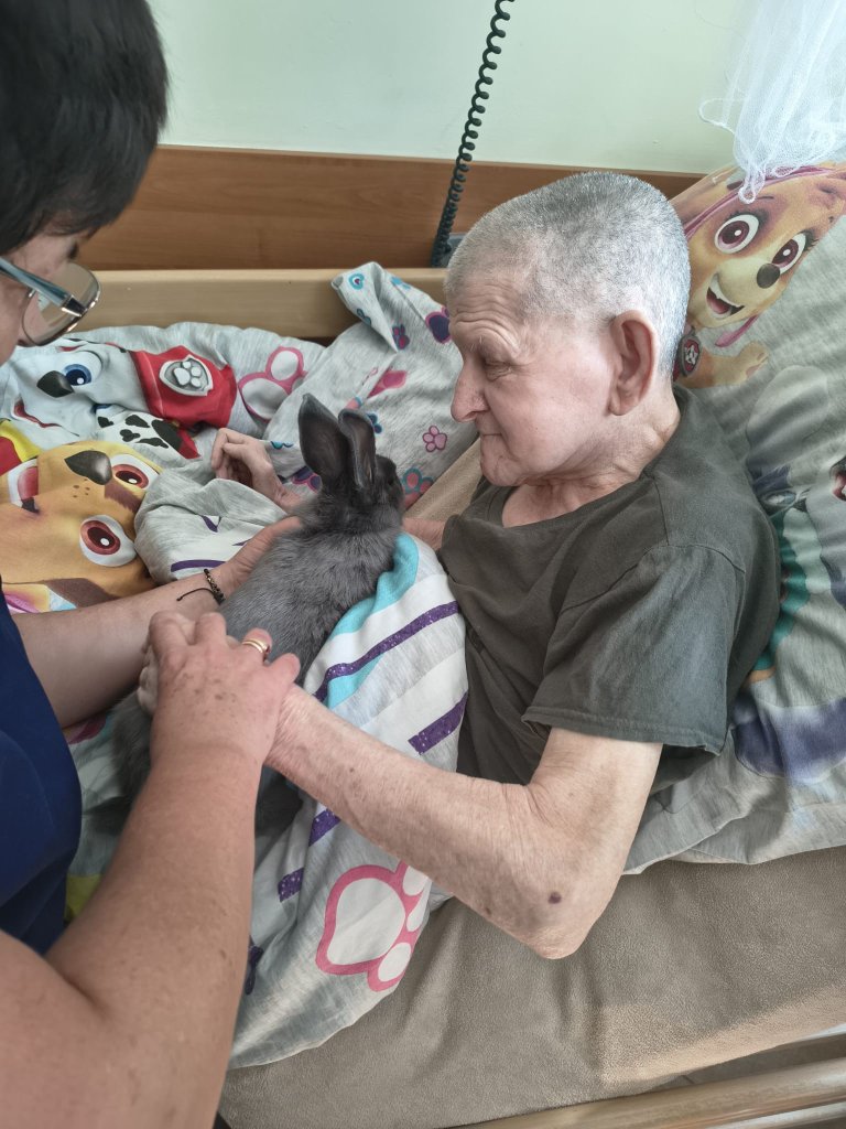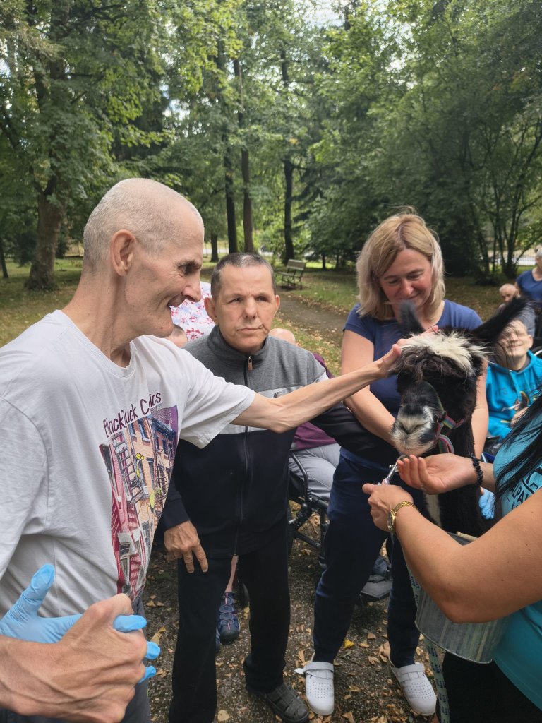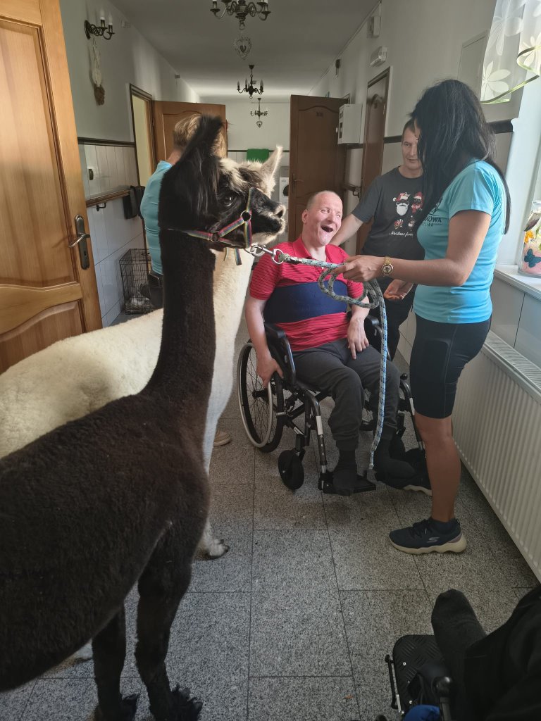 Oryginalne spotkanie naszych mieszkańców z alpakami oraz królikami miało miejsce w naszej placówce. Bezpośredni kontakt ze zwierzętami, możliwość karmienia, głaskanie, oprowadzanie to po prostu fantastyczna forma terapii co widać było na uśmiechniętych i zachwyconych twarzach mieszkańców. Natomiast wizyta alpak na grupie osób leżących, możliwość bliskiego kontaktu z tymi cudownie spokojnymi i przemiłymi wręcz zwierzętami, które w swojej łagodności szczególnie dały się "zaprzyjaźnić" wzbudzając wśród opiekunów i postronnych obserwatorów emocje i niedowierzanie, że tak zwierzę może reagować na chorego człowieka.