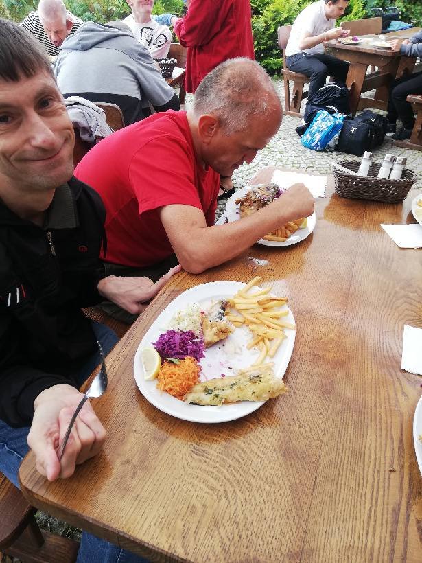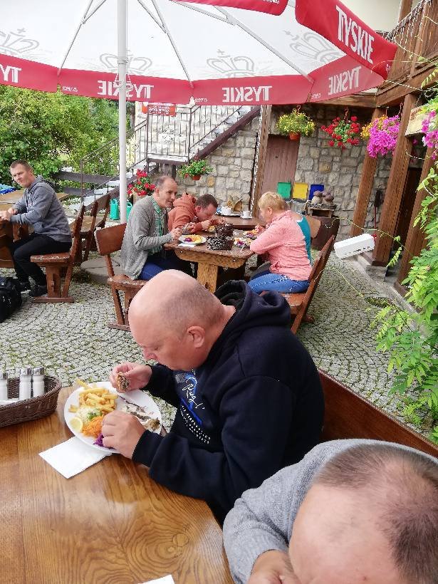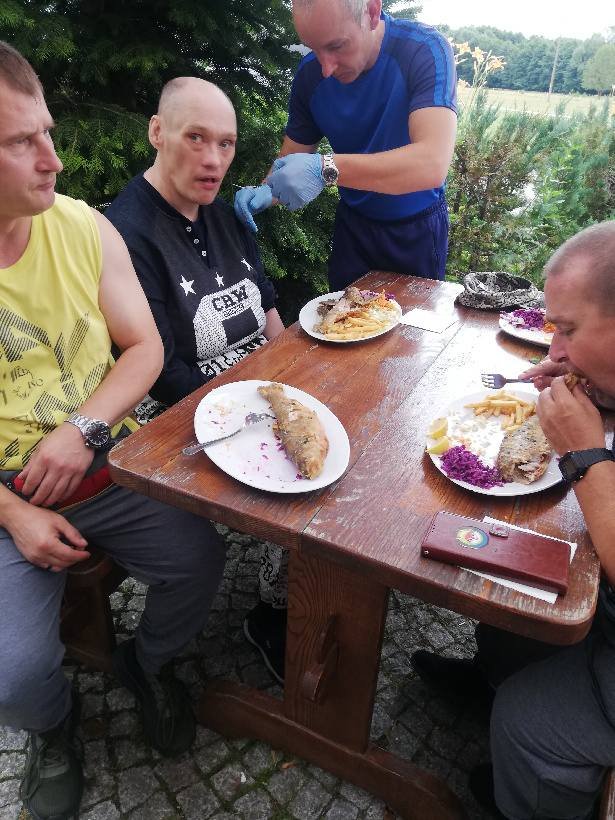 18 lipca pojechaliśmy do miejscowości Wolany na rybkę. Malowniczo położona smażalnia niedaleko Kłodzka. Dodatkową atrakcją, na którą od razu zwrócili uwagę nasi mieszkańcy była możliwość oglądania i podziwiania wspaniałego stada koni znajdującego się po drugiej stronie ulicy. Tym razem "konsumencka grupa rybożerców" składała się z mieszkańców dość rzadko (ze względu na swoją niepełnosprawność) uczestniczących w tego typu wydarzeniach. Jednak dali radę spożywając pstrąga, niektórzy fileta z miruny i frytki oraz zestaw surówek.