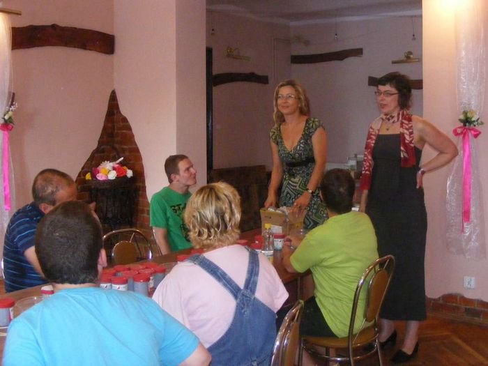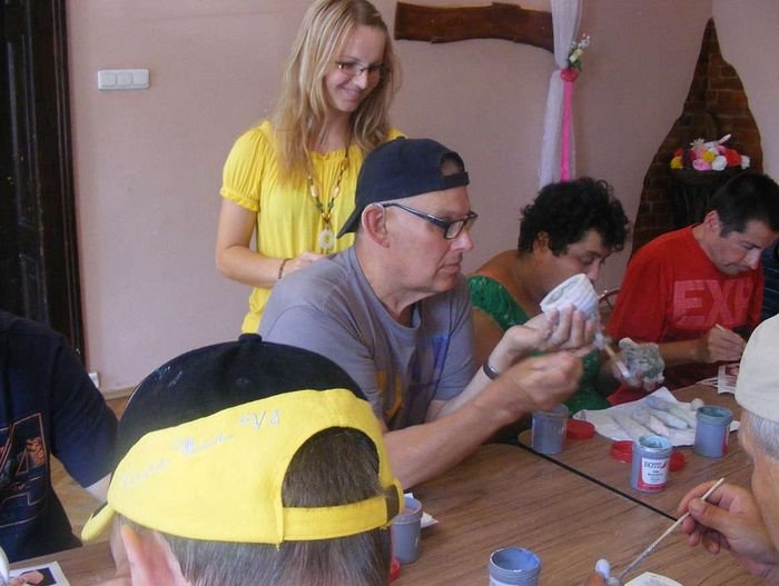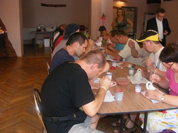 W drugiej części imprezy mieszkańcy DPS w Podzamku i Domov pod hradem Žampach podzieleni na 16 osobowe grupy uczestniczyli w warsztatach ceramicznych i muzycznych (8 osób z DPS W Podzamku i 8 osób z Domov pod hradem Žampach). Jedną z grup pod kierunkiem Pani Agnieszki Merczyńskiej zdobiła dzwonki ceramiczne wykonane na poprzednim spotkaniu. Uczestnicy mieli do dyspozycji wiele różnokolorowych szkliw, każda praca była więc jedyna w swoim rodzaju i niepowtarzalna.