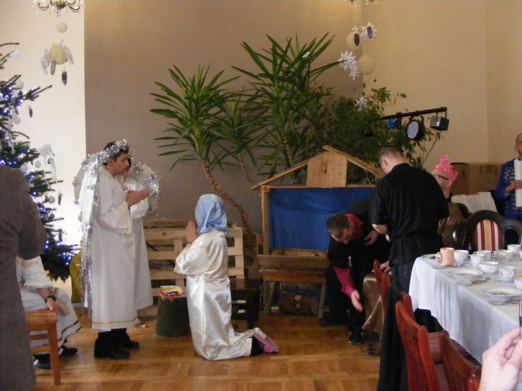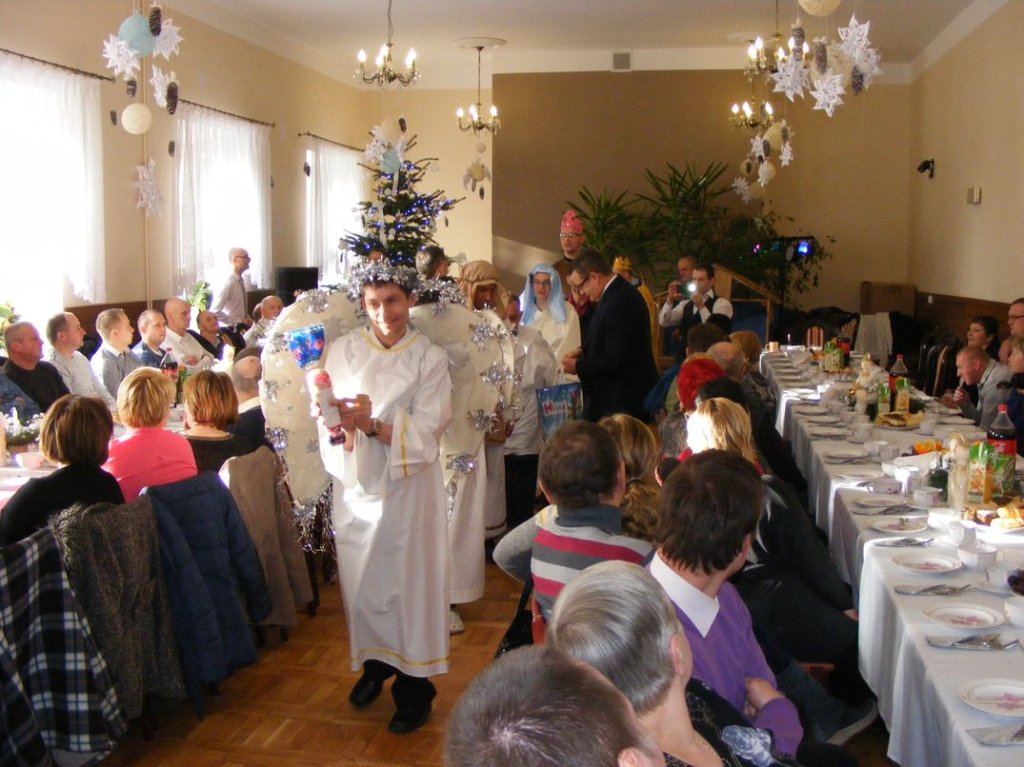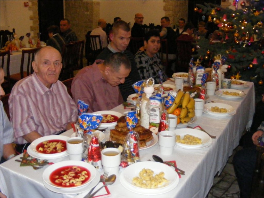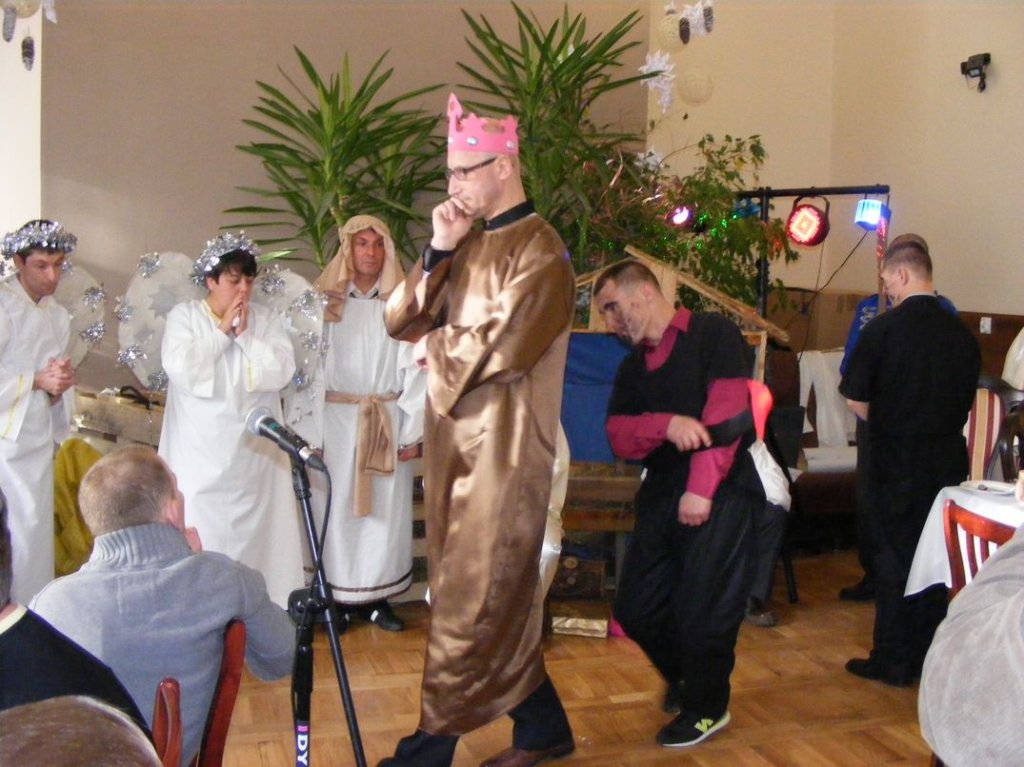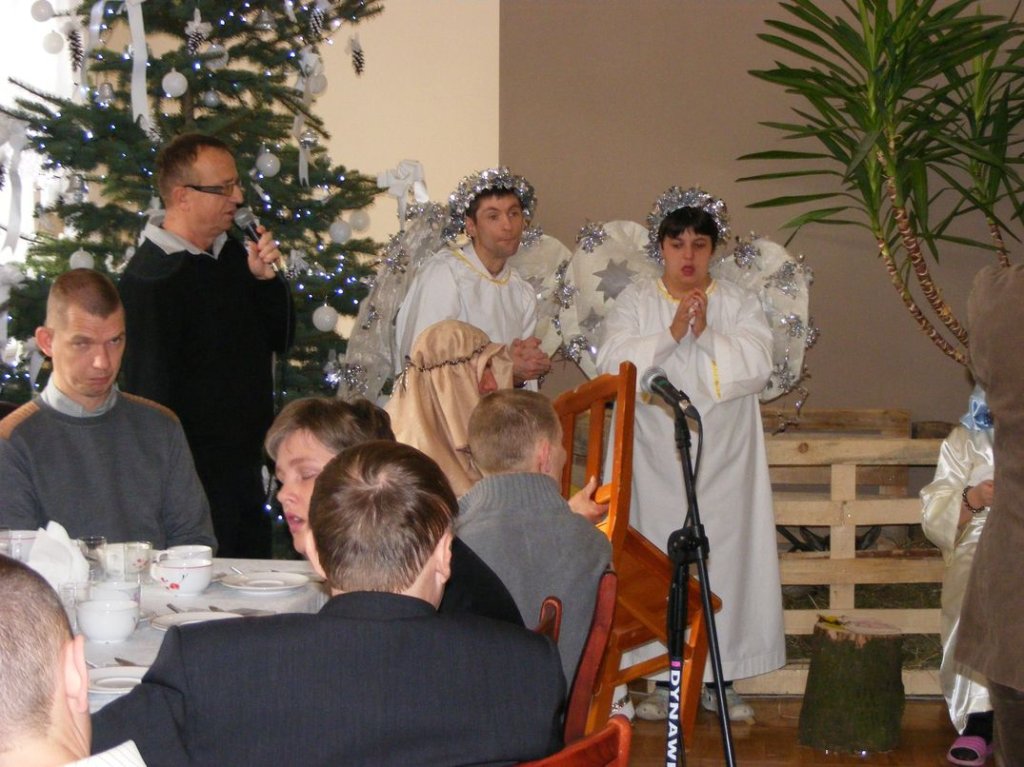 Była to opowieść o tym jak wielkie znaczenie dla czasów współczesnych mają narodziny Jezusa Chrystusa. Bardzo wielką furorę zrobiła również prawdziwa koza, o imieniu Fruzia, która „pięknie” i co najważniejsze, ze stoickim spokojem brała udział w Jasełkach jako zwierzę ze stajenki, miejsca narodzin Jezusa. Po występie mieszkańców głos zabrał Starosta Maciej Awiżeń, który bardzo ciepło wyraził miłe opinie na temat naszej placówki, życząc mieszkańcom i ich rodzinom, zdrowych, radosnych Świąt Bożego Narodzenia. Bardzo pięknie przemówił o. Emanuel życząc wszystkim zebranym Bożego Błogosławieństwa. Po wspólnie odmówionej modlitwie wszyscy składali sobie życzenia, przełamując się opłatkiem przy cichych dźwiękach kolęd,by zaraz potem zasiąść do pięknie nakrytego stołu wigilijnego. Natomiast w dzień wigilii Bożego narodzenia tradycyjnie o godz. 17.00 w zabytkowej sali kominkowej mieszkańcy z dyrektorem Panem Zbigniewem Turem spotkali się na wieczerzy wigilijnej. I ja tam byłem i śpiewałem kolędy, a co na stołach było to na zdjęcia można zobaczyć.