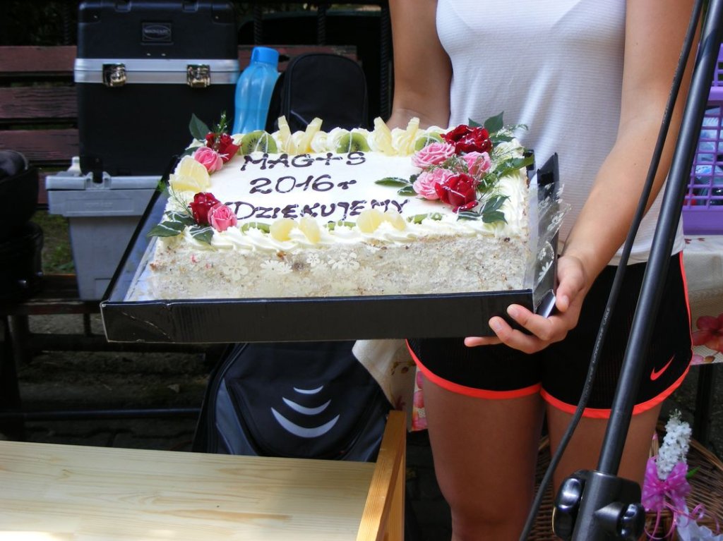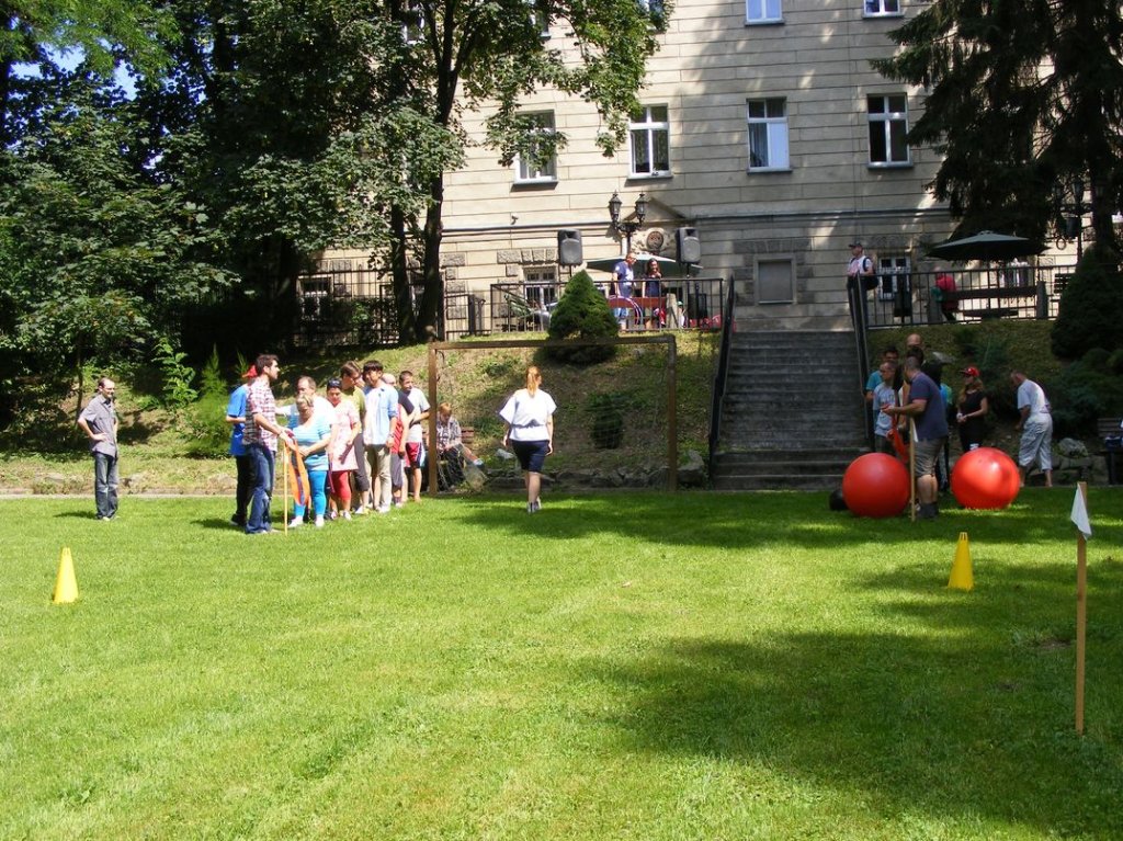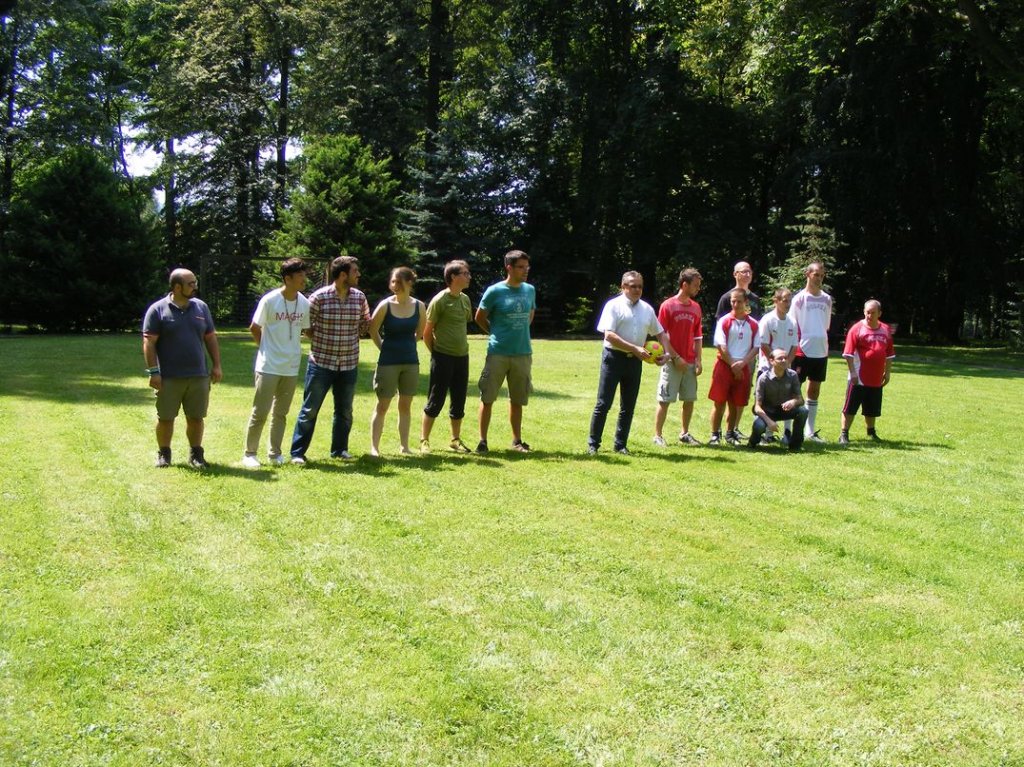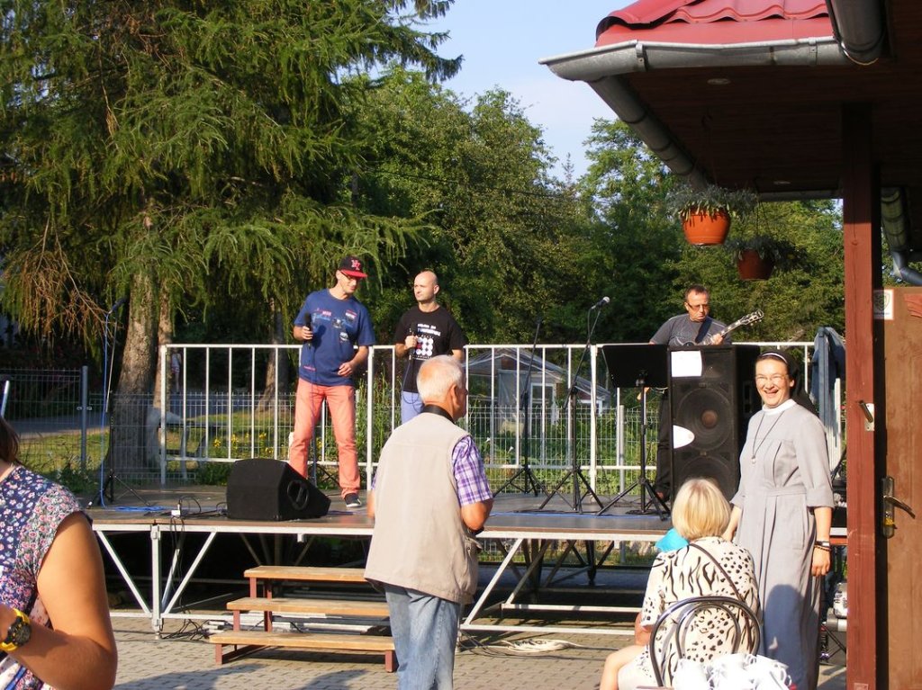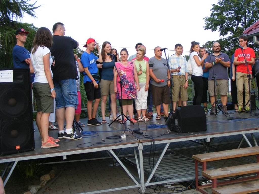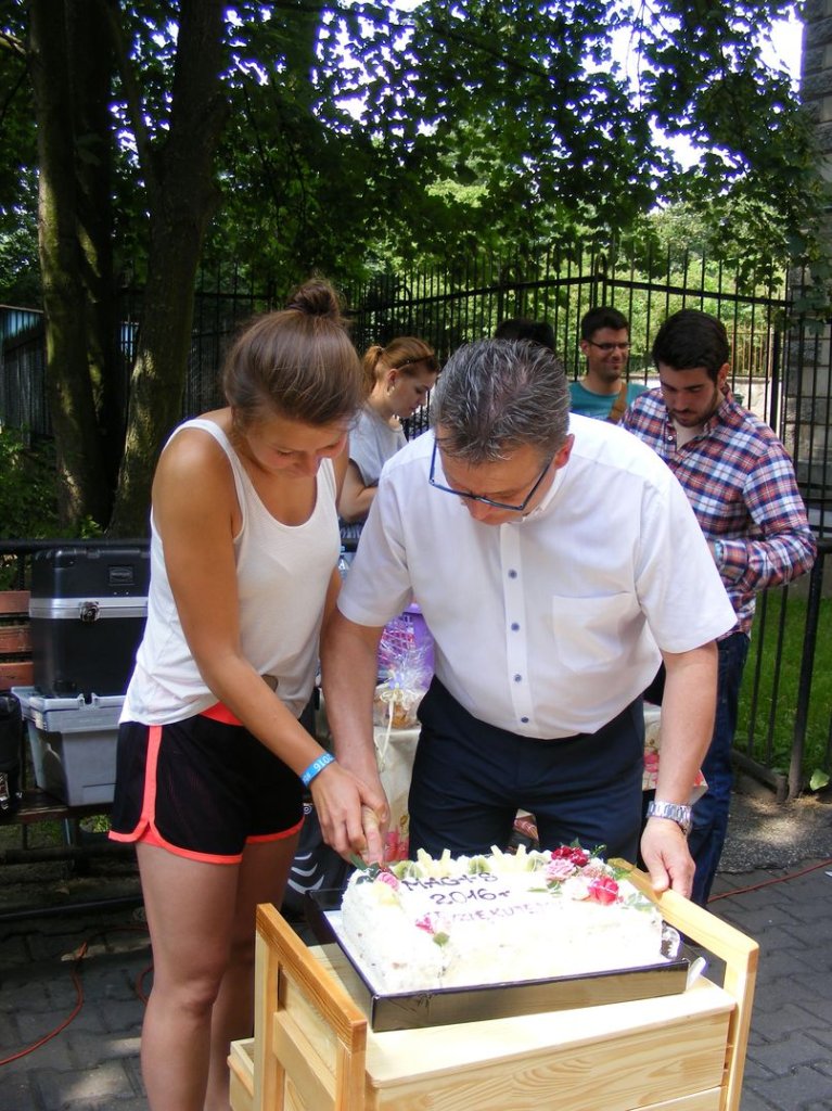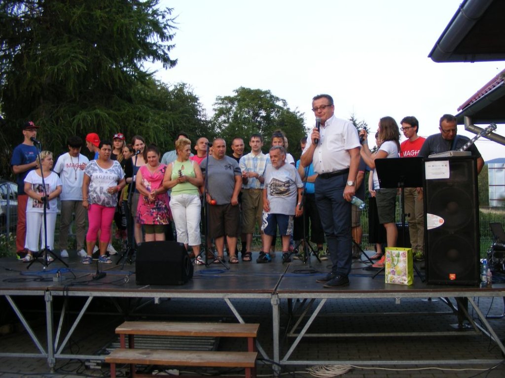 Na zakończenie , w piątek odbył się piknik sportowy na którym między innymi obok zabaw przy muzyce, różnych konkursów , miało miejsce międzypaństwowe spotkanie w piłkę nożną, gdzie nie obyło się bez sensacji tzn. drużyna nasza wygrała . Na koniec nasi goście dostali śliczne upominki oraz płyty ze zdjęciami z pobytu w Podzamku, sami zaś ufundowali dla naszych mieszkańców wspaniały tort, zapraszając jednocześnie na popołudnie, naszych mieszkańców na przyjęcie i spotkanie integracyjne do Boguszyna gdzie spotkają się inni pielgrzymi przed wyjazdem do Krakowa na ŚDM. Podziękowaniom i łzom nie było końca..... . Myślę, że jeśli ktoś nie może zrozumieć jak mogą razem ze sobą przebywać ludzie tak bardzo różni od siebie, powinien zobaczyć to, co miało miejsce w naszej Placówce. Dziękujemy wam drodzy przyjaciele za wspólnie spędzone, piękne chwile.