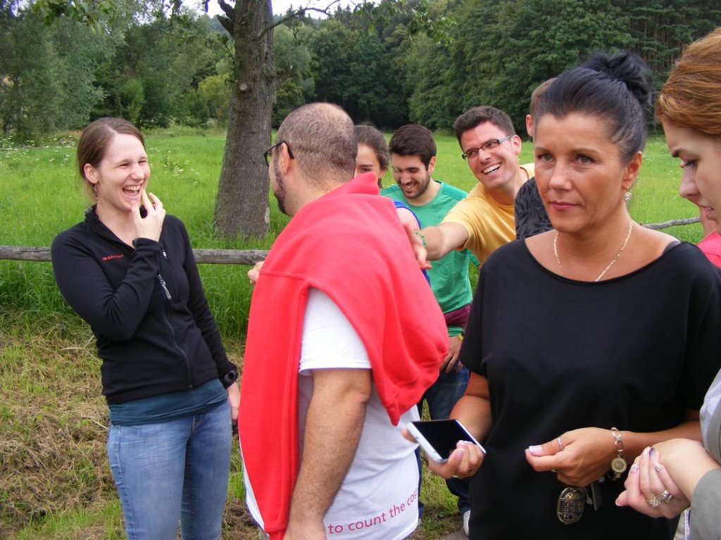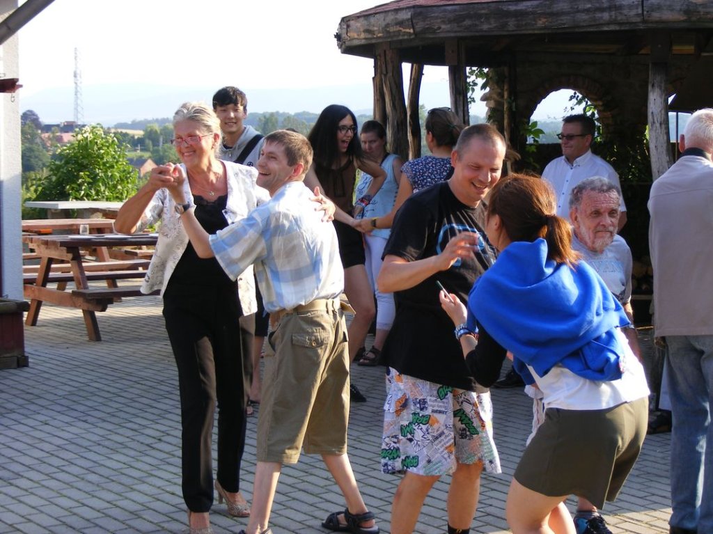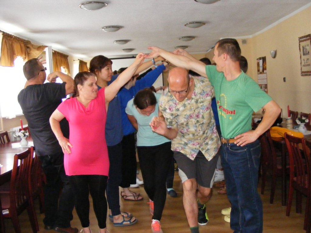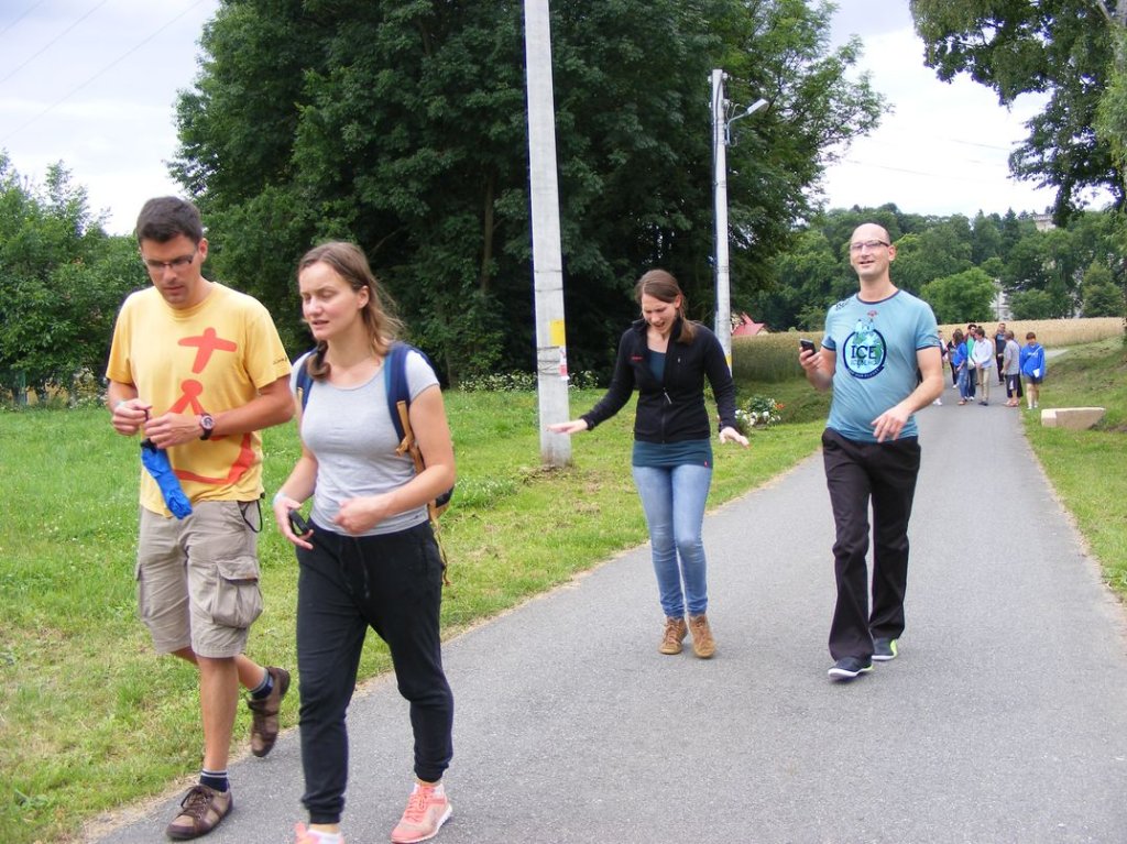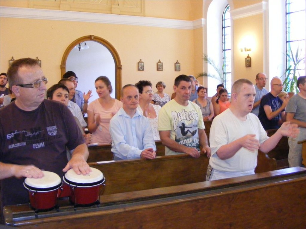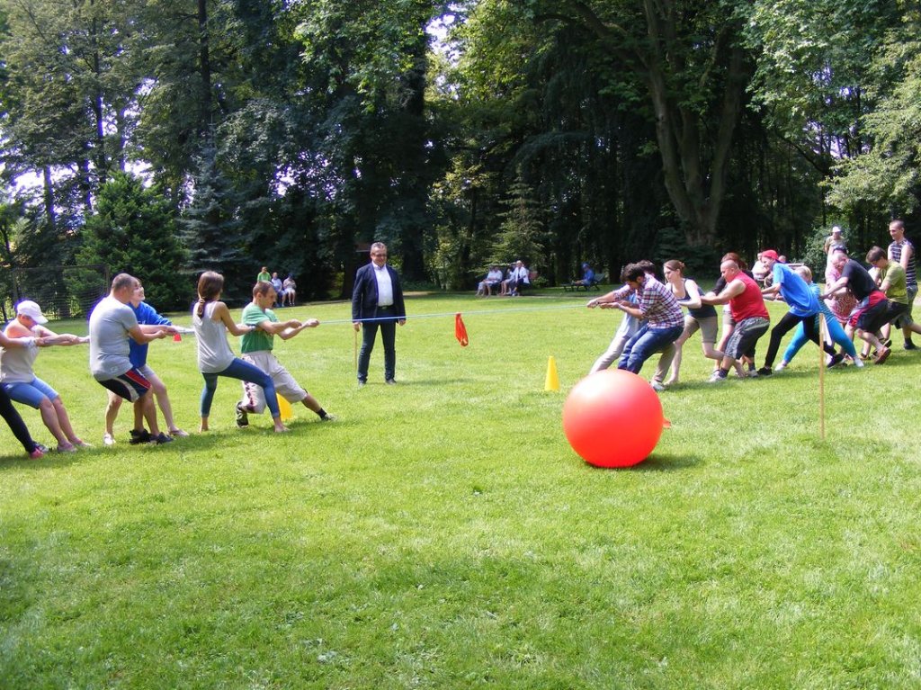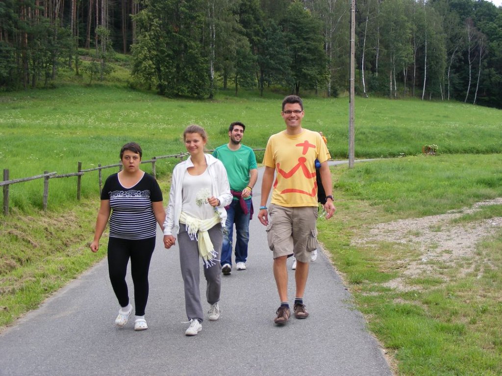 Na zakończenie , w piątek odbył się piknik sportowy na którym między innymi obok zabaw przy muzyce, różnych konkursów , miało miejsce międzypaństwowe spotkanie w piłkę nożną, gdzie nie obyło się bez sensacji tzn. drużyna nasza wygrała . Na koniec nasi goście dostali śliczne upominki oraz płyty ze zdjęciami z pobytu w Podzamku, sami zaś ufundowali dla naszych mieszkańców wspaniały tort, zapraszając jednocześnie na popołudnie, naszych mieszkańców na przyjęcie i spotkanie integracyjne do Boguszyna gdzie spotkają się inni pielgrzymi przed wyjazdem do Krakowa na ŚDM. Podziękowaniom i łzom nie było końca..... . Myślę, że jeśli ktoś nie może zrozumieć jak mogą razem ze sobą przebywać ludzie tak bardzo różni od siebie, powinien zobaczyć to, co miało miejsce w naszej Placówce. Dziękujemy wam drodzy przyjaciele za wspólnie spędzone, piękne chwile.