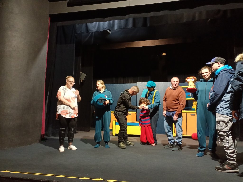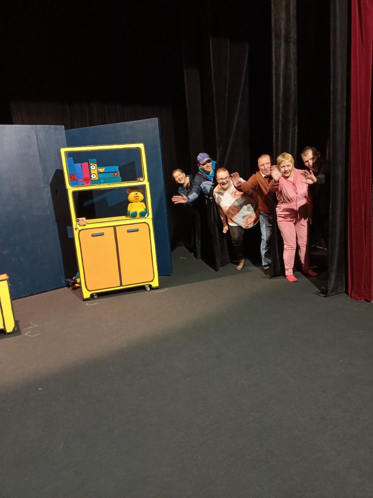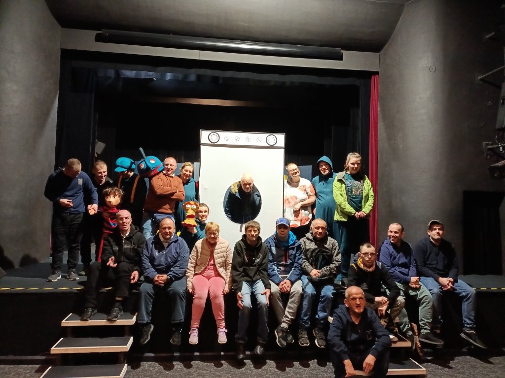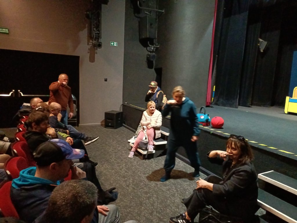 Tym razem nasz pobyt w teatrze nie był tylko związany z oglądaniem spektaklu pt. "Władca skarpetek" ale przede wszystkim ze spotkaniem w formie warsztatów z profesjonalną aktorką Teatru Lalki i Aktora. Nasi mieszkańcy mogli zapoznać się z techniką sztuki aktorskiej, ćwiczeniami związanych z emisją głosu, poruszaniem się na scenie, operowaniem w sposób zawodowy dźwiękiem, a co najważniejsze mogli samodzielnie zaprezentować się aktorsko na scenie teatru.