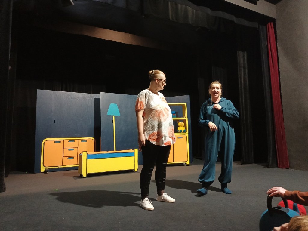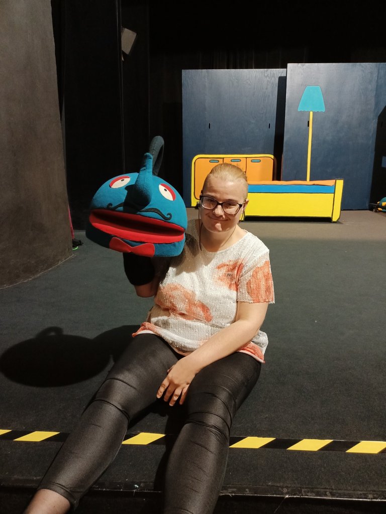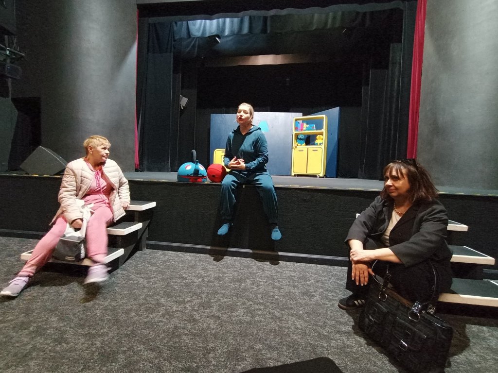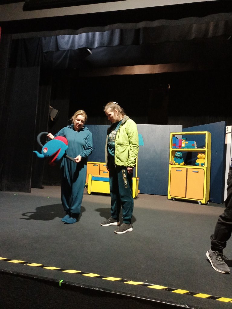 Tym razem nasz pobyt w teatrze nie był tylko związany z oglądaniem spektaklu pt. "Władca skarpetek" ale przede wszystkim ze spotkaniem w formie warsztatów z profesjonalną aktorką Teatru Lalki i Aktora. Nasi mieszkańcy mogli zapoznać się z techniką sztuki aktorskiej, ćwiczeniami związanych z emisją głosu, poruszaniem się na scenie, operowaniem w sposób zawodowy dźwiękiem, a co najważniejsze mogli samodzielnie zaprezentować się aktorsko na scenie teatru.