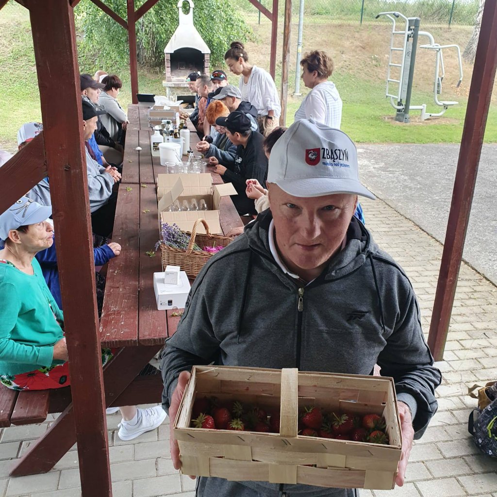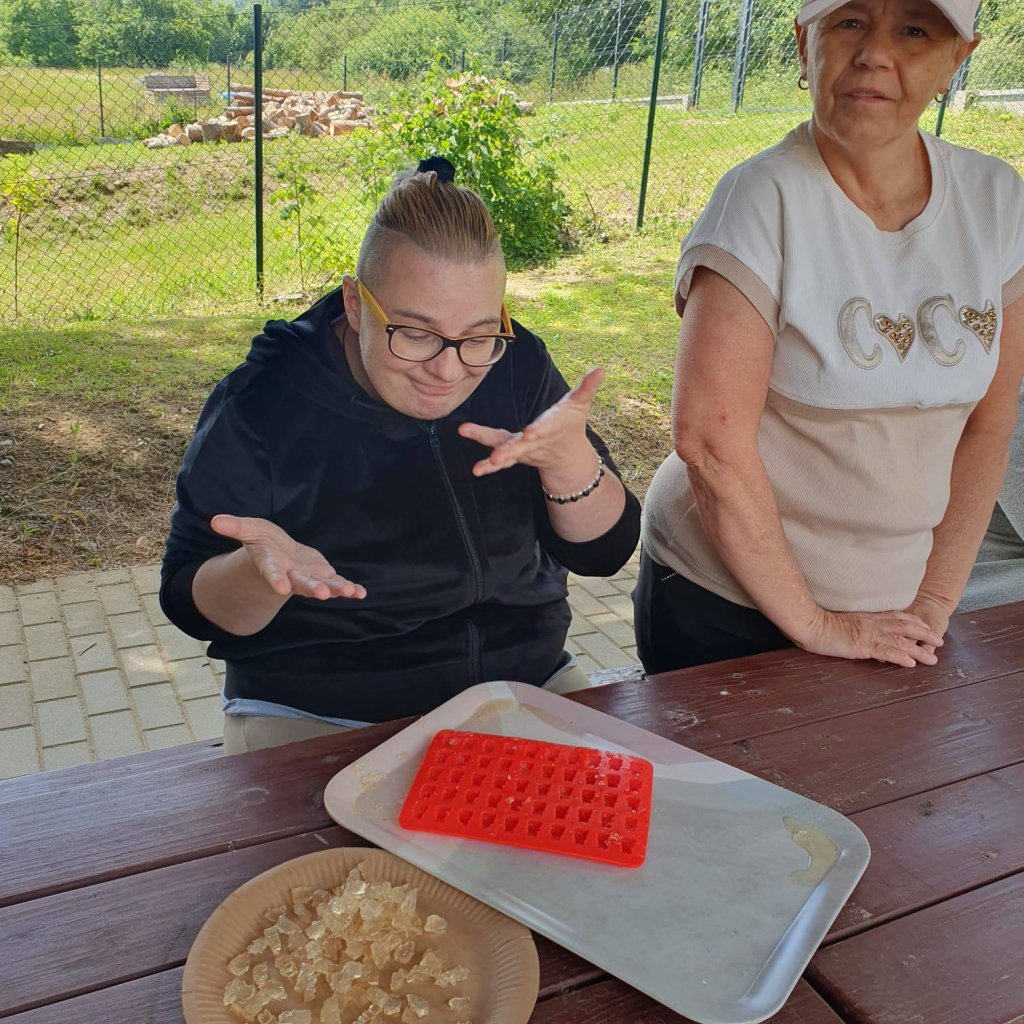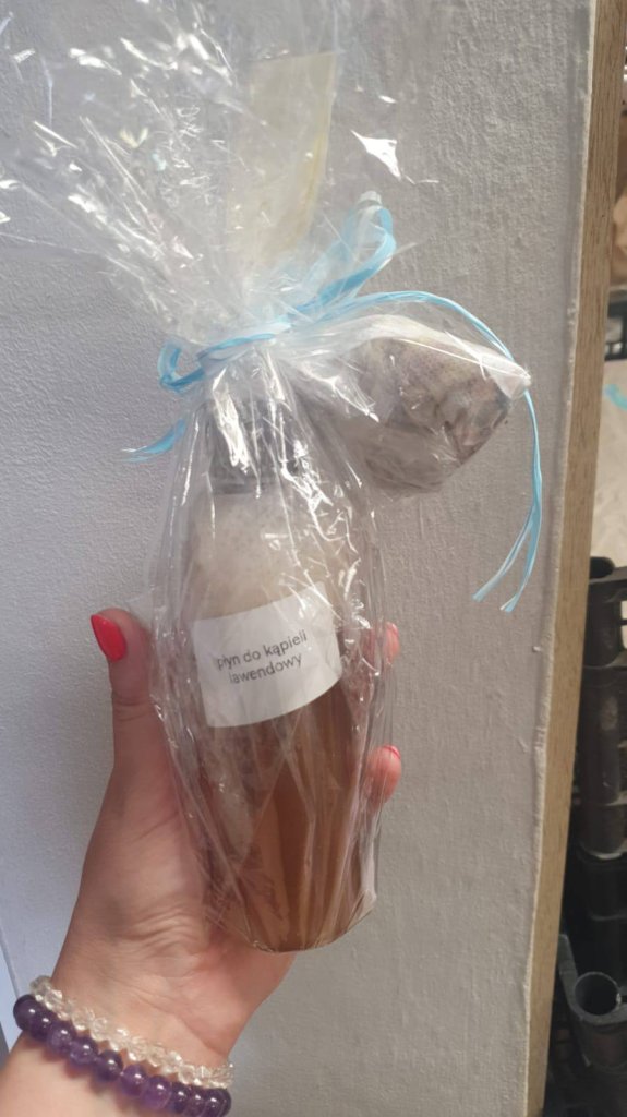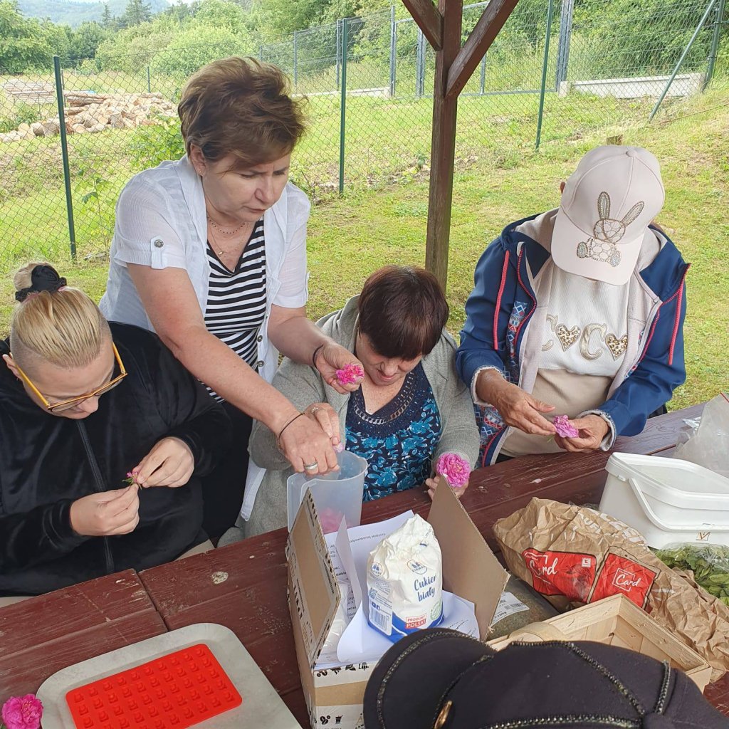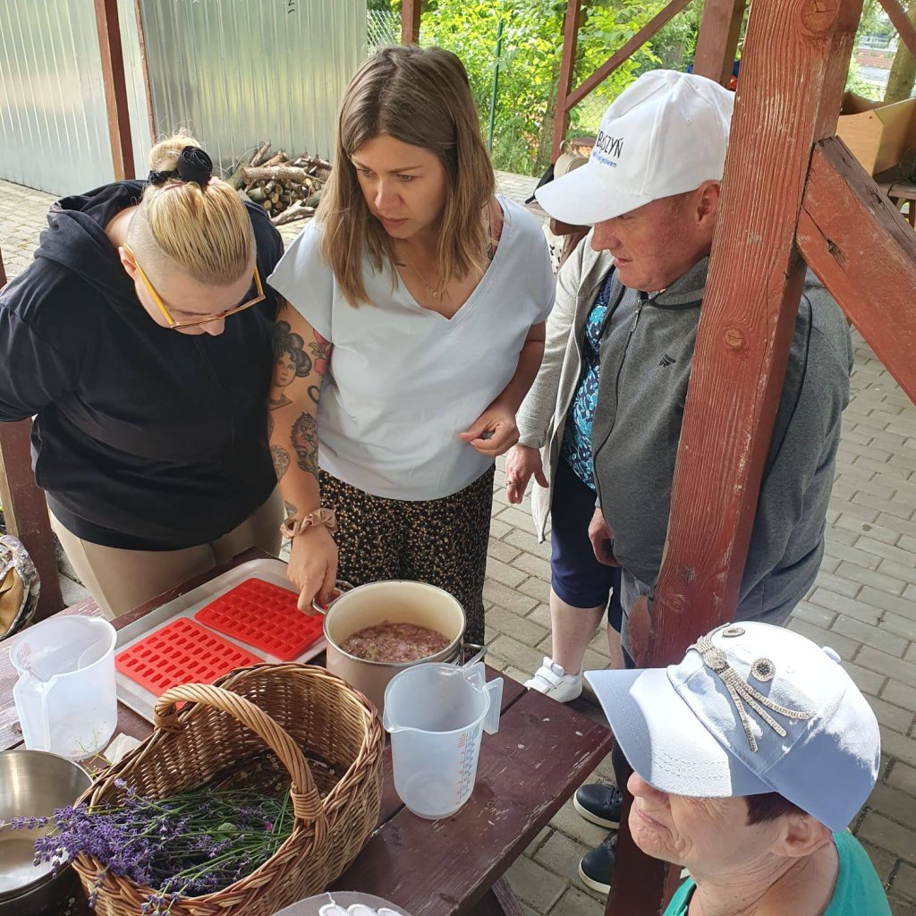 Pani Marta z "ziołografii" przywitała nas smacznymi truskawkami. W ramach warsztatów zielarskich pracę zaczęliśmy od zrobienia żelek z naparu kwiatów białego bzu oraz płatków róży. Gdy żelki w lodówce zastygały tworzyliśmy płyny do kąpieli, gdzie podstawą był napar z kwiatów lawendy. Stworzyliśmy 2 rodzaje płynów, na bazie różnych olejów i mydeł oraz różnych zapachów. Dodatkowo robiliśmy 2 herbatki, uspokajająca i na przeziębienie, które także samodzielnie pakowaliśmy do torebeczek.