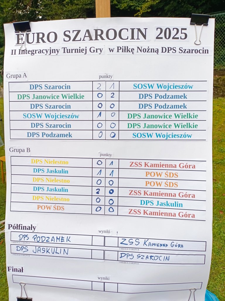 Każdego roku DPS w Szarocinie organizuje dla wielu placówek z Powiatu Kamiennogórskiego zawody w piłkę nożną. Nasza drużyna ze względu na długoletnią przyjaźń między DPS Szarocin, a DPS Podzamek dzielnie reprezentowała Powiat Kłodzki również uczestnicząc w zawodach. Trzeba przyznać, że w tym roku nasi piłkarze grali wspaniale wychodząc z grupy na pierwszym miejscu, natomiast w fazie pucharowej w walce o finał ulegli niestety późniejszemu mistrzowi tylko w rzutach karnych, niezwykle loteryjnych.